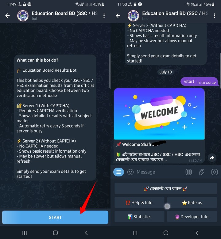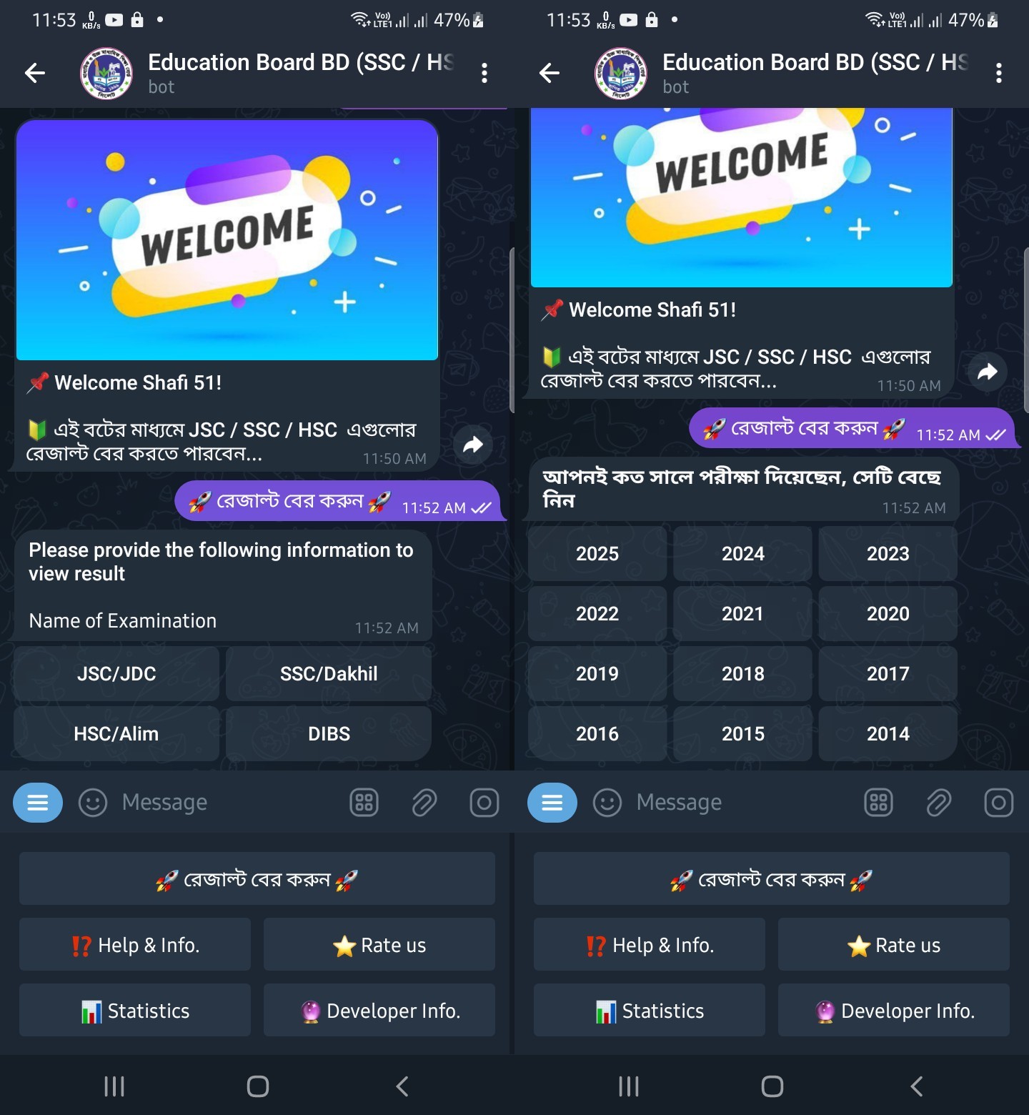 1. প্রথমে Education Board BD (SSC / HSC Result) Bot টি স্টার্ট করুন